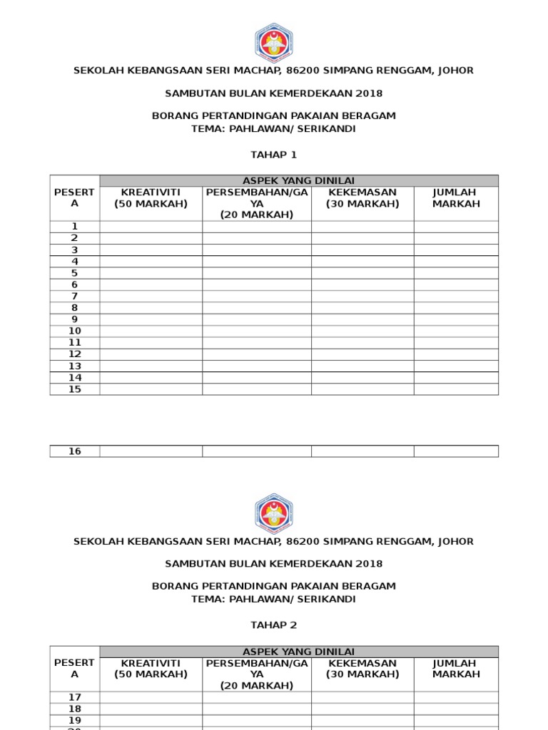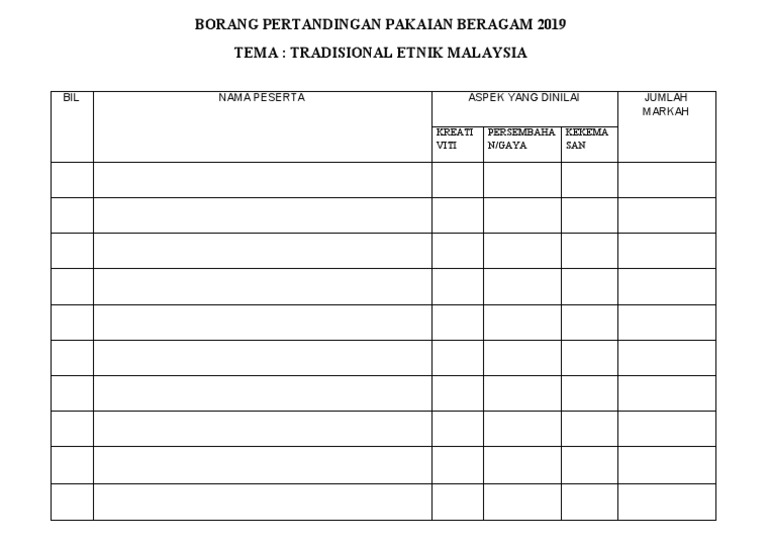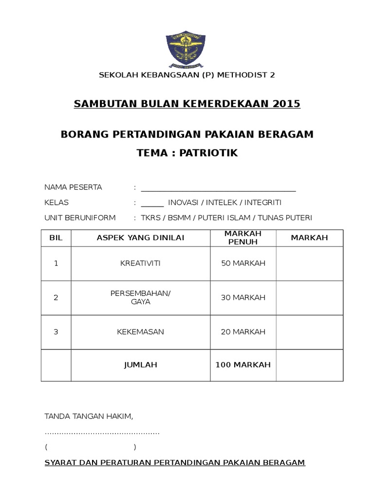Yosia raduck 2 years ago. 2019 10 18 pertandingan pakaian beragam tema 60an sempena hari kanak kanak. Sambutan bulan kemerdekaan 2015 borang pertandingan pertandingan pakaian beragam tema : Text of borang markah pertandingan pakaian beragam.docx. Sambutan bulan kemerdekaan 2013 sekolah kebangsaan padang tengku borang pertandingan pakaian beragam borang pertandingan pakaian beragamtema :